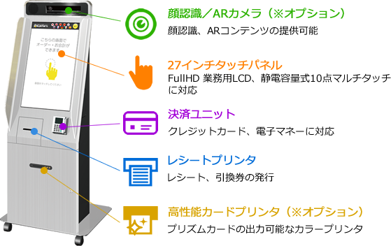 顔認識機能により、利用者の性別・年齢別の購入データを取得集計することで商品購入データ分析が可能です。またARセンサー(※オプション)によりエンターテイメント性が高く楽しいARアプリケーション等を提供することが可能です。■ 高性能プリンタによるメンバーズカード、クーポンなどのカード商品も対応